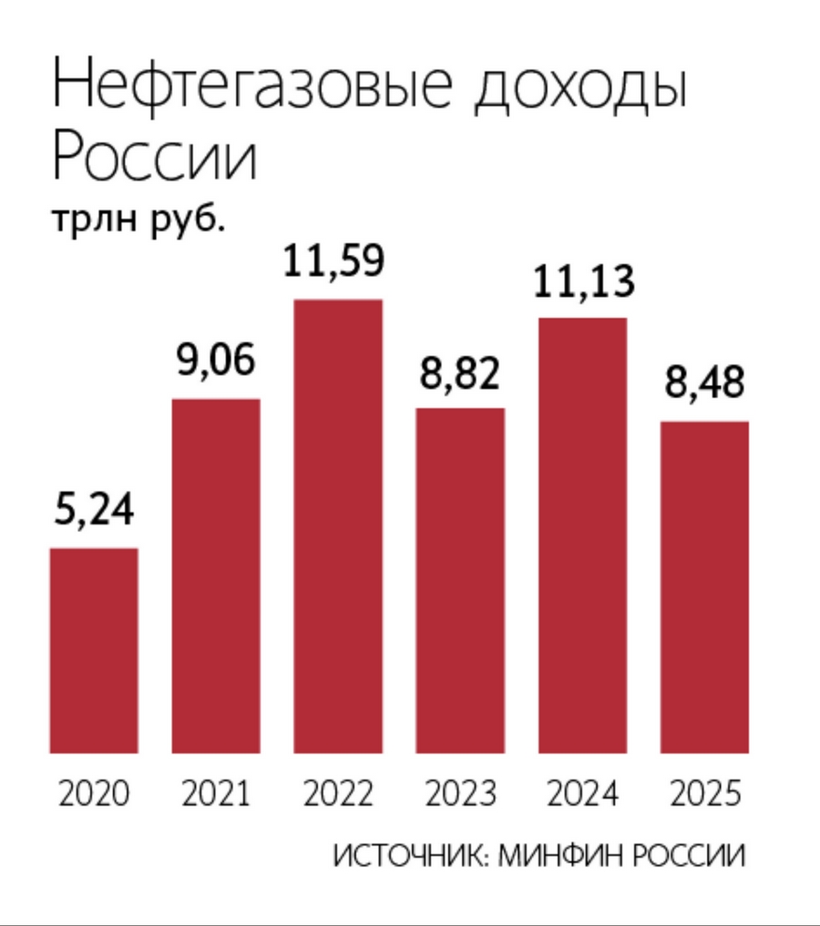 По сообщениям Минфин РФ, нефтегазовые доходы (НГД) бюджета России за 2025 г. составили 8,4768 трлн руб., снизившись на 23,8% к 2024 г. В ноябре 2025 г. НГД составили 530,9 млрд руб., против 801,7 млрд руб. в ноябре 2024 г. Снижение на 33,79% или более чем в 1,5 раза в годовом сравнении.